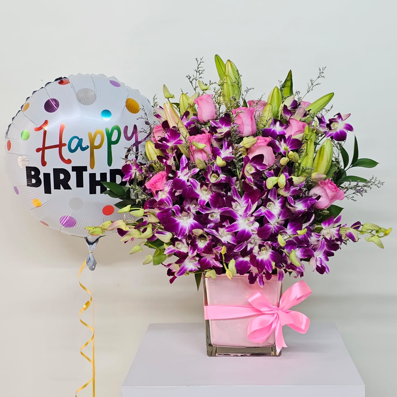 Best birthday gift Birthday Delight is a vibrant and elegant floral arrangement designed to make birthdays truly unforgettable. This stunning creation includes 35 fresh flower stems featuring rich purple orchids, soft pink roses, graceful lilies, and delicate fillers, all artistically styled in a premium glass vase. Paired with a cheerful Happy Birthday foil balloon, it brings instant joy and celebration to any space.