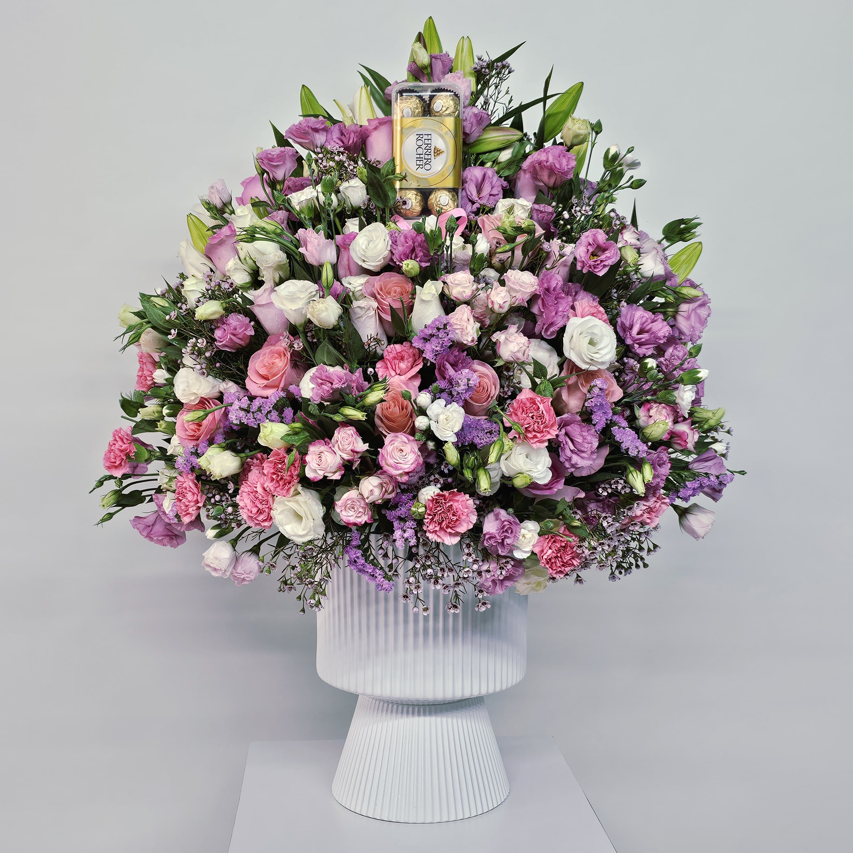 Introducing the Bloom Pot, a stunning premium floral arrangement crafted to express deep love and heartfelt emotions. Beautifully designed in an elegant pot, this luxurious creation features a blend of exquisite blooms paired with indulgent Ferrero Rocher chocolates arranged on top, making it a perfect romantic gesture. Its rich textures, elegant presentation, and thoughtful details transform it into a meaningful gift that speaks the language of love effortlessly.