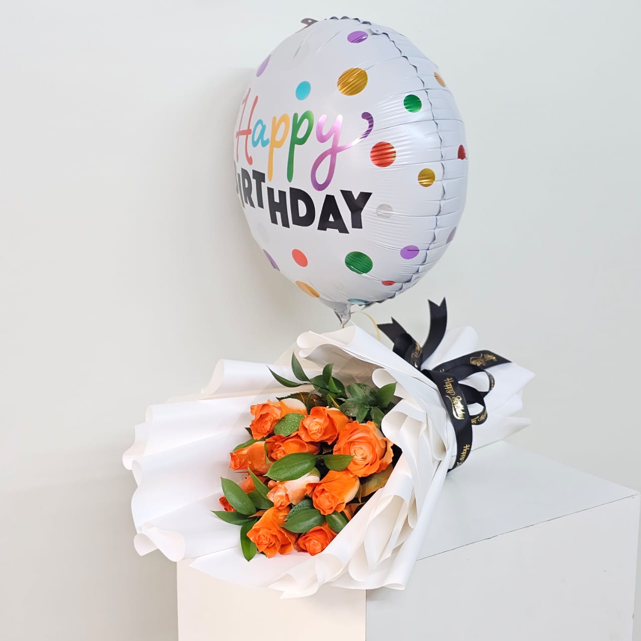 Citrus Bloom Delight is a vibrant expression of joy, warmth, and celebration! This charming orange roses bouquet features 12 stunning hand-picked roses wrapped elegantly in crisp white paper and finished with a sleek black tie — creating a perfect contrast of style and sophistication. Accompanied by a cheerful birthday balloon, it’s a thoughtful and refreshing way to send your best wishes on someone’s special day.