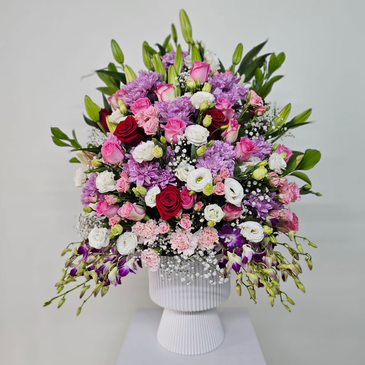 Large mix flower pot – Grand Celebration is designed to make a breathtaking impression. This grand arrangement showcases a luxurious blend of roses, lilies, chrysanthemums, lisianthus, orchids, and seasonal fillers, artistically styled in an elegant decorative pot. With vibrant shades of pink, purple, red, and white, it creates a rich visual impact that instantly elevates any celebration space.