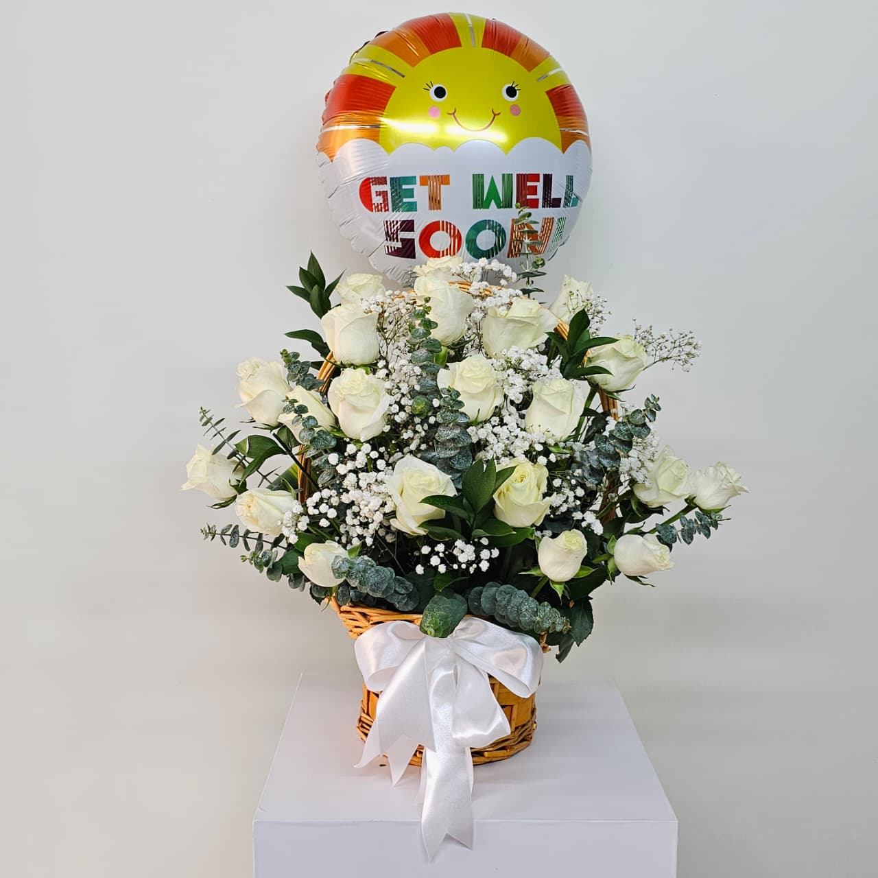 Roses getwell gift – Healing White Wishes is a gentle and meaningful way to send comfort, positivity, and recovery wishes to someone who is unwell. This elegant arrangement features 21 fresh white roses beautifully arranged in a classic basket, symbolizing peace, healing, and calm. Complimented with a Get Well Soon message balloon, it instantly lifts spirits and brings warmth to hospitals, homes, and recovery rooms.