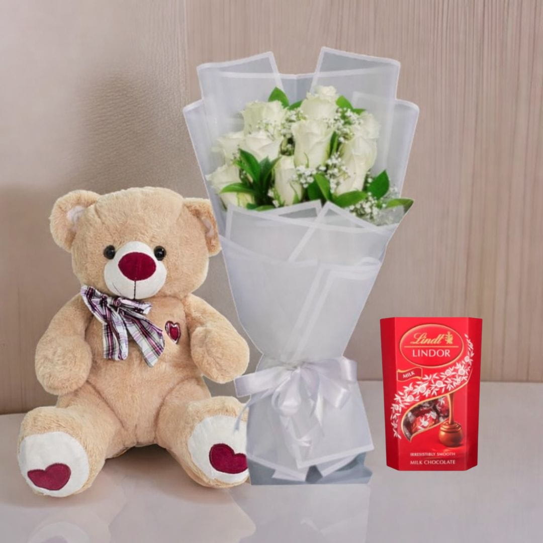 White roses are the symbol of respect and peace and are sure to convey the deep sentiments of love in a wonderful manner. Bouquet of 12 white roses, teddy and chocolates are most suitable to be given on your dear ones birthday. This combo gift will create a strong bond between two persons and will remain stronger forever. Give a great surprise to the people you love with a bouquet of flowers that represents purity and love. Show how much value you have given to them in your life by giving a doorstep delivery at their address anywhere in Dubai by ordering online from our website.